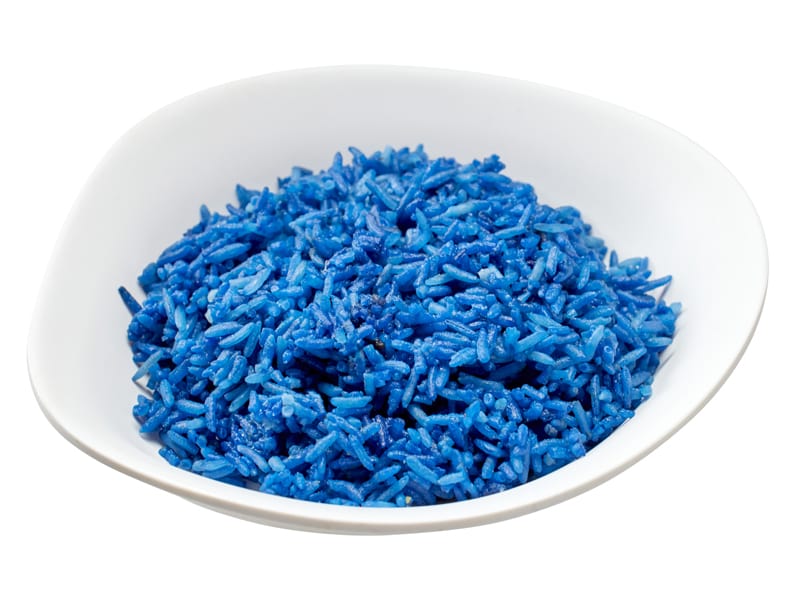 crispy cauliflower florets with sweet & spicy chili sauce, coconut blue rice, Thai cucumbers and edamame