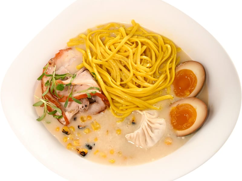 slow roasted porchetta, udon noodles, tare egg, roast corn, vegetable dumpling, tonkotsu broth