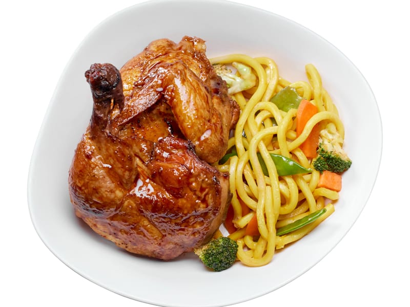 Szechuan glazed rotisserie chicken, stir fried vegetable lo mein